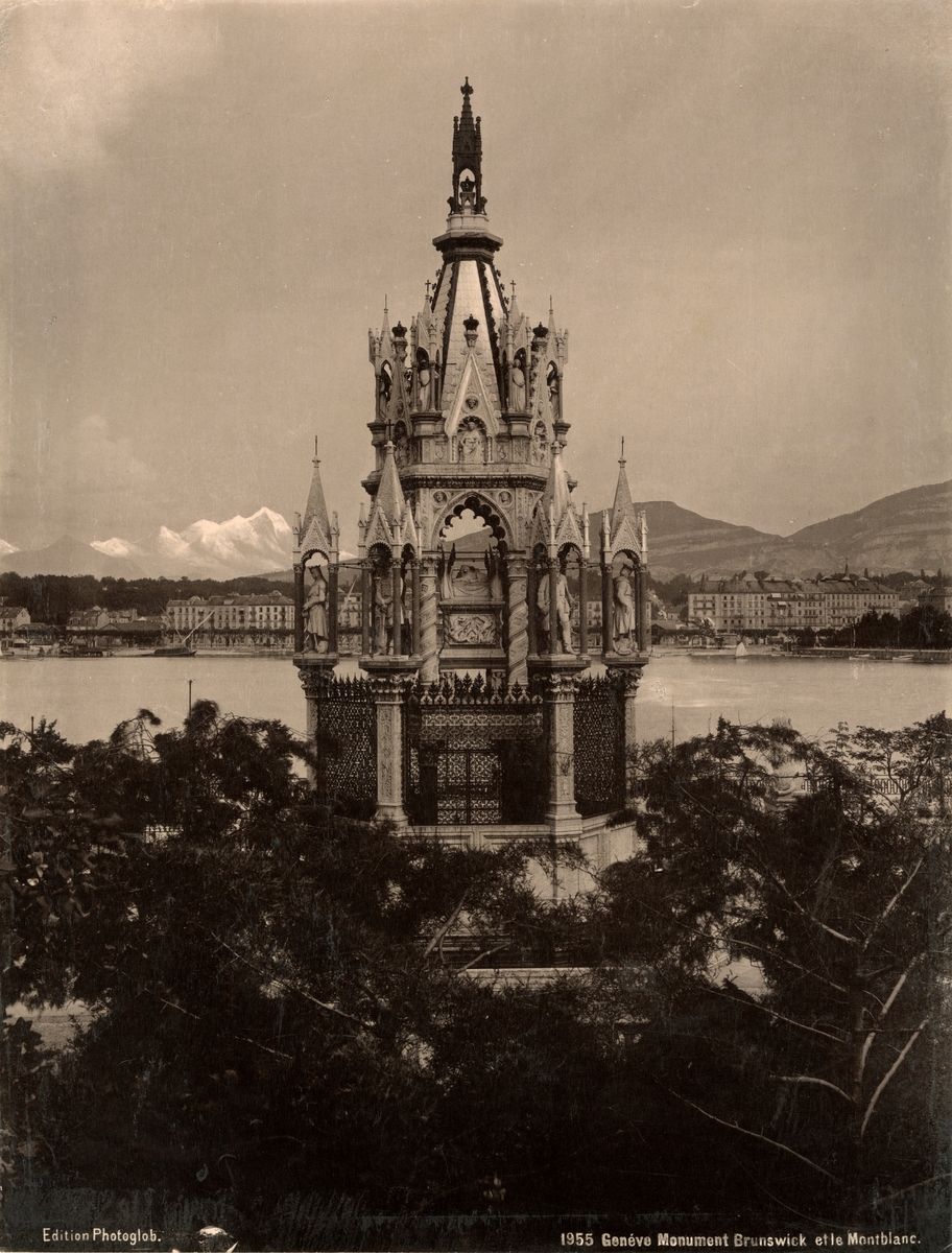 Monument Brunswick med Genéve och berget Mont Blac i bakgrunden. "Edition Photoglob no 1955".