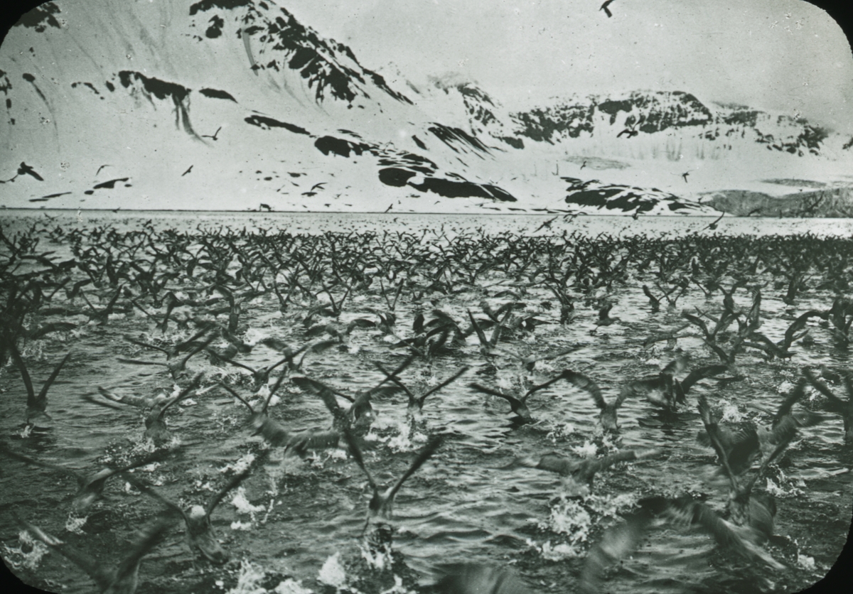 Fotografi från expedition till Spetsbergen. Motiv av stor fågelflock som fångar fisk.