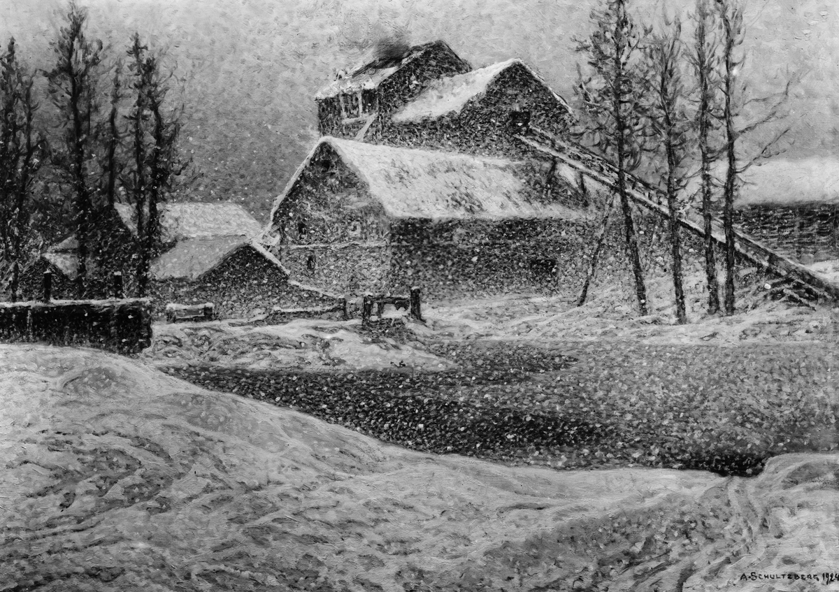 Storbrohyttan. Oljemålning 1924 av Anshelm Schulzberg (1862- ).