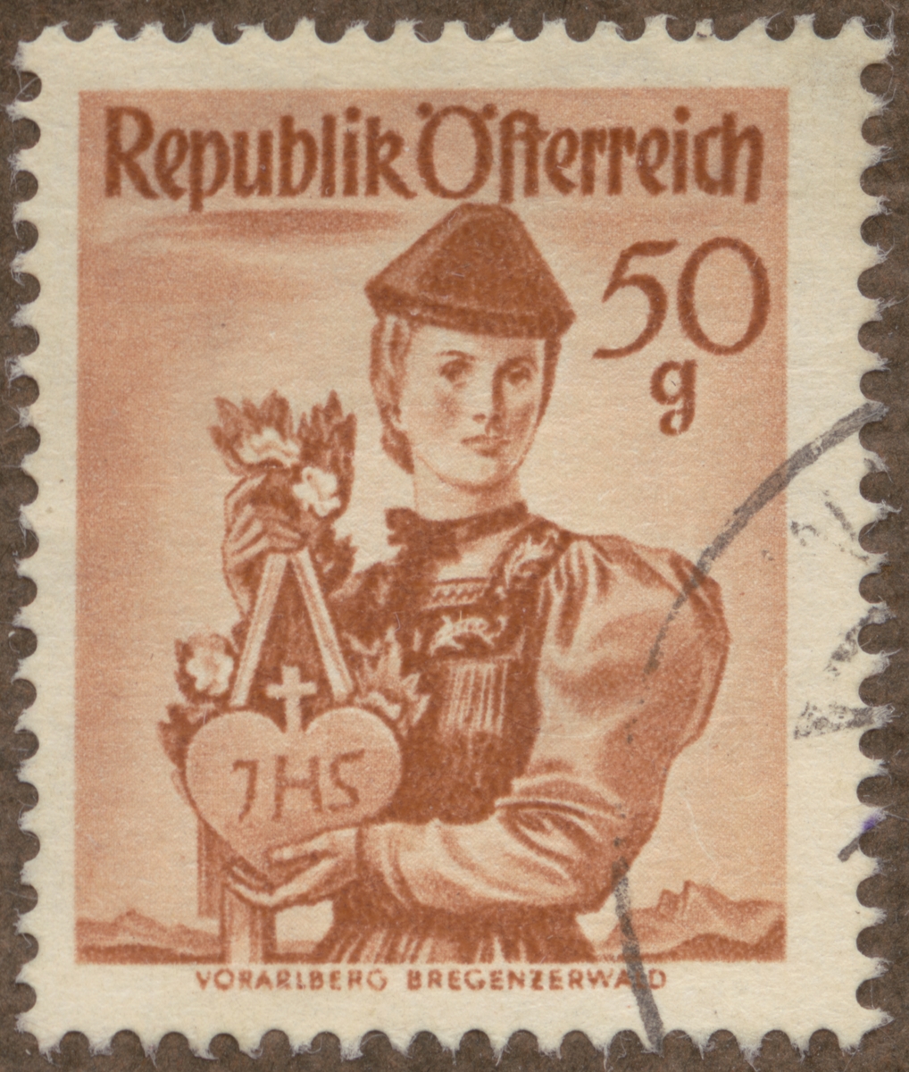 Frimärke från Österrike, 1948. Motiv av kvinnodräkt, Vorarlberg Bregenzerwald.