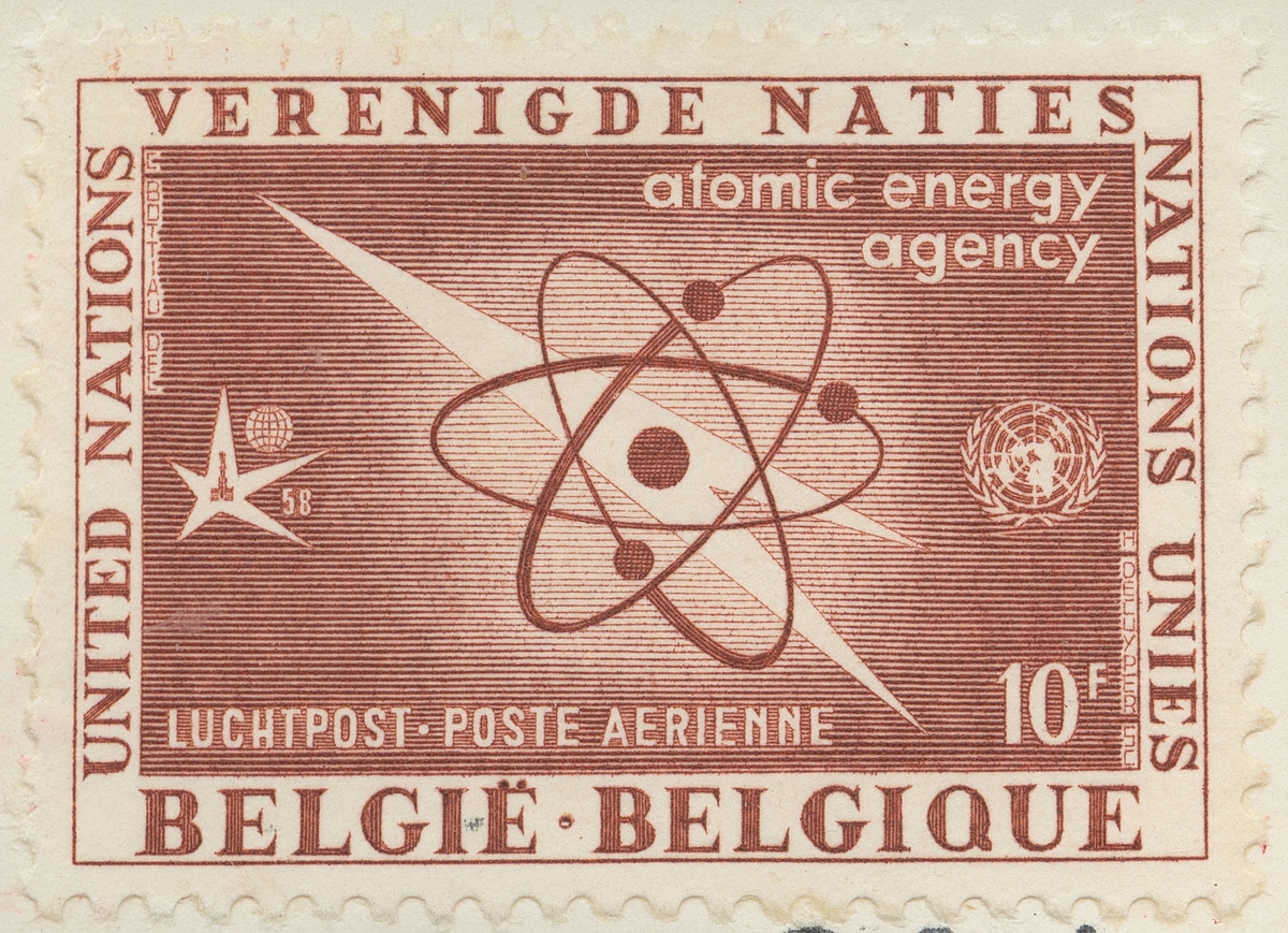 Frimärke ur Gösta Bodmans filatelistiska motivsamling, påbörjad 1950. Frimärke från Belgien, 1958. Motiv av Symboler för atomenergien och FN "Ur FN serie till Bryssel Utställningen 1958 10 f. ="International Atomic Energy Agency""