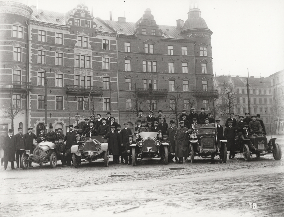 Elever vid Eric Lundviks körskola, samlade kring fem automobiler på Karlaplan, omkring 1915-1920.