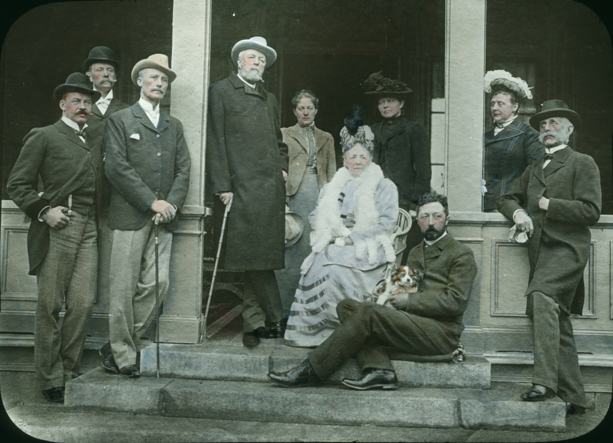 Kolorerad skioptikonbild med motiv av Oscar II (Oskar II) med familj och vänner.