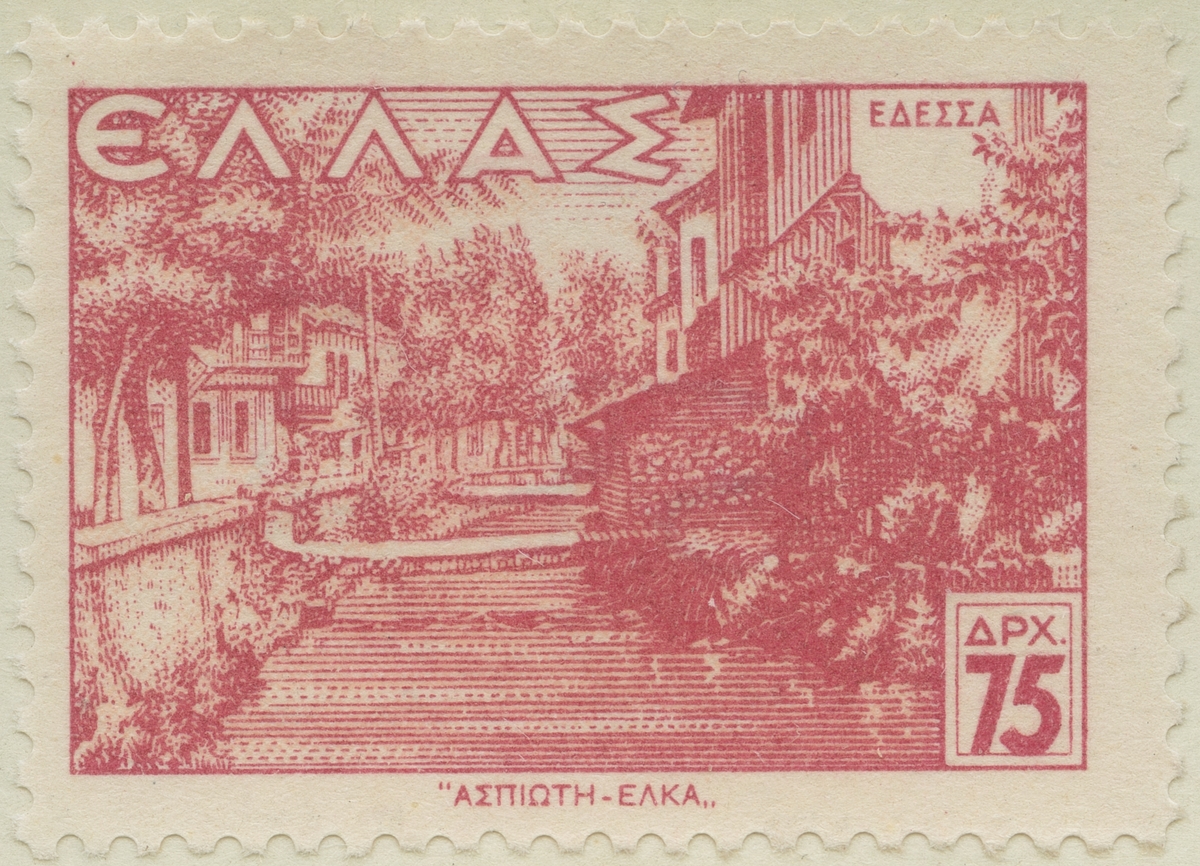 Frimärke ur Gösta Bodmans filatelistiska motivsamling, påbörjad 1950. Frimärke från Grekland, 1942. Motiv av Flodlandskap från staden Edessa (nuv. Vodena) i Macedonien.