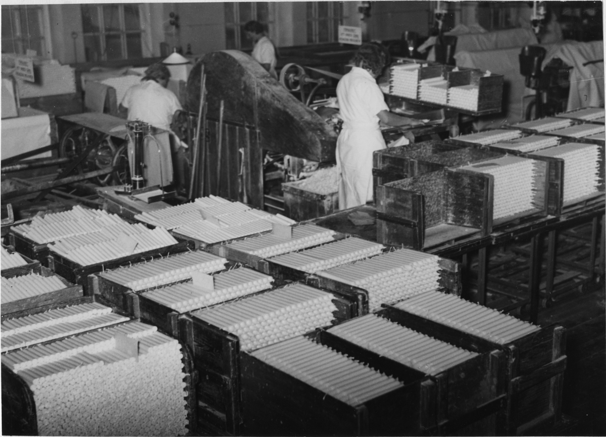 Liljeholmens Stearinfabrik. Stearinljusen packas in.