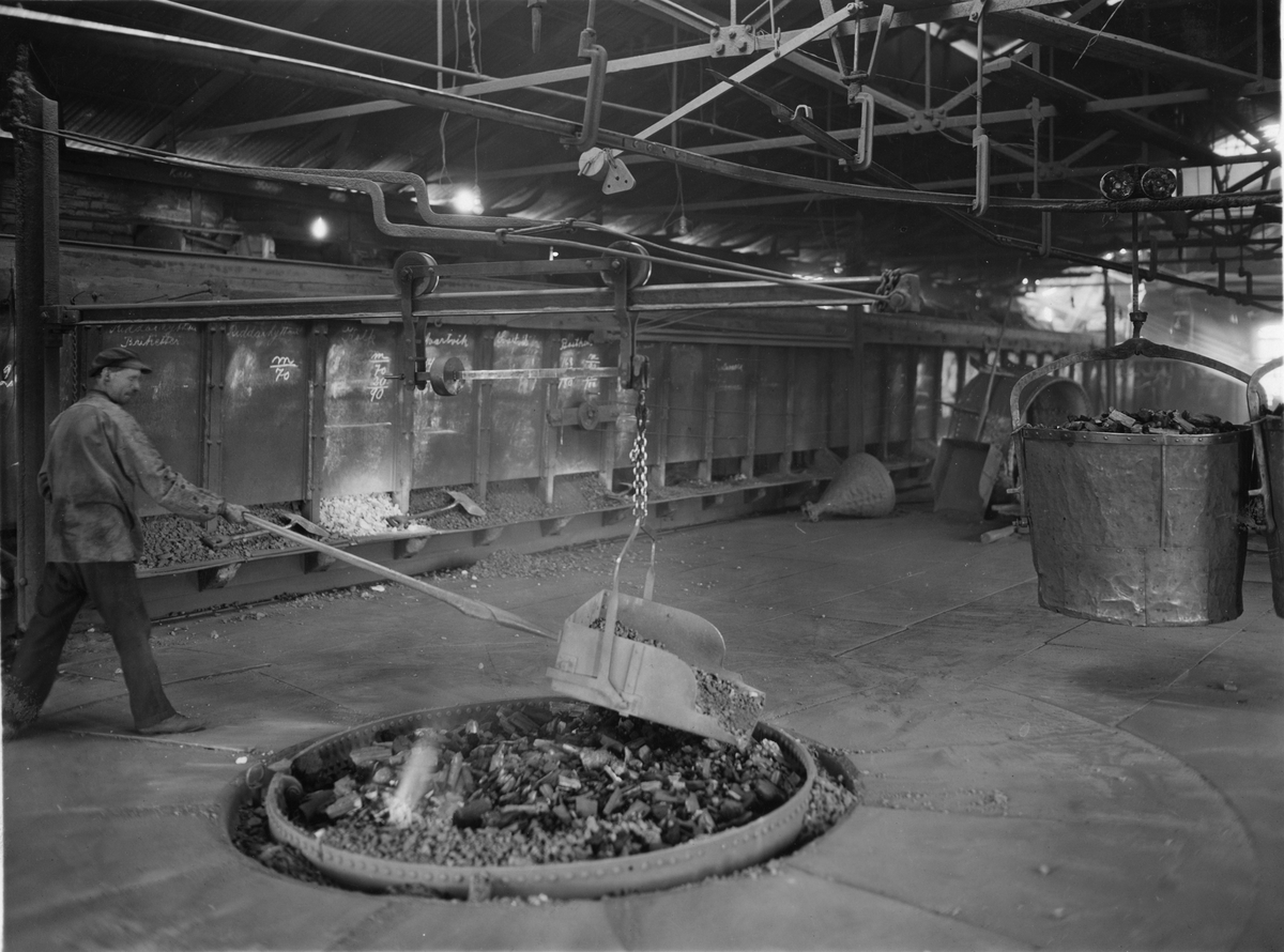 Sandvikens Järnverk (Sandvikens Jernverk). Uppsättning av malm och tråkol på masugnskransen. Genom rena råmaterialet, nämligen svavel- och fosforfattiga malmer, samt träkol som bränsle, och genom processens omsorgsfulla skötsel grundlägges redan i masugnen det blivande stålets kvalitet. Observera att de olika malmsorterna noggrant vägas på den våg, som på bilden, uppbär skopan, träkolet, till höger på bilden, uppmätes i kolhuset och ankommer på lina till masugnskransen.