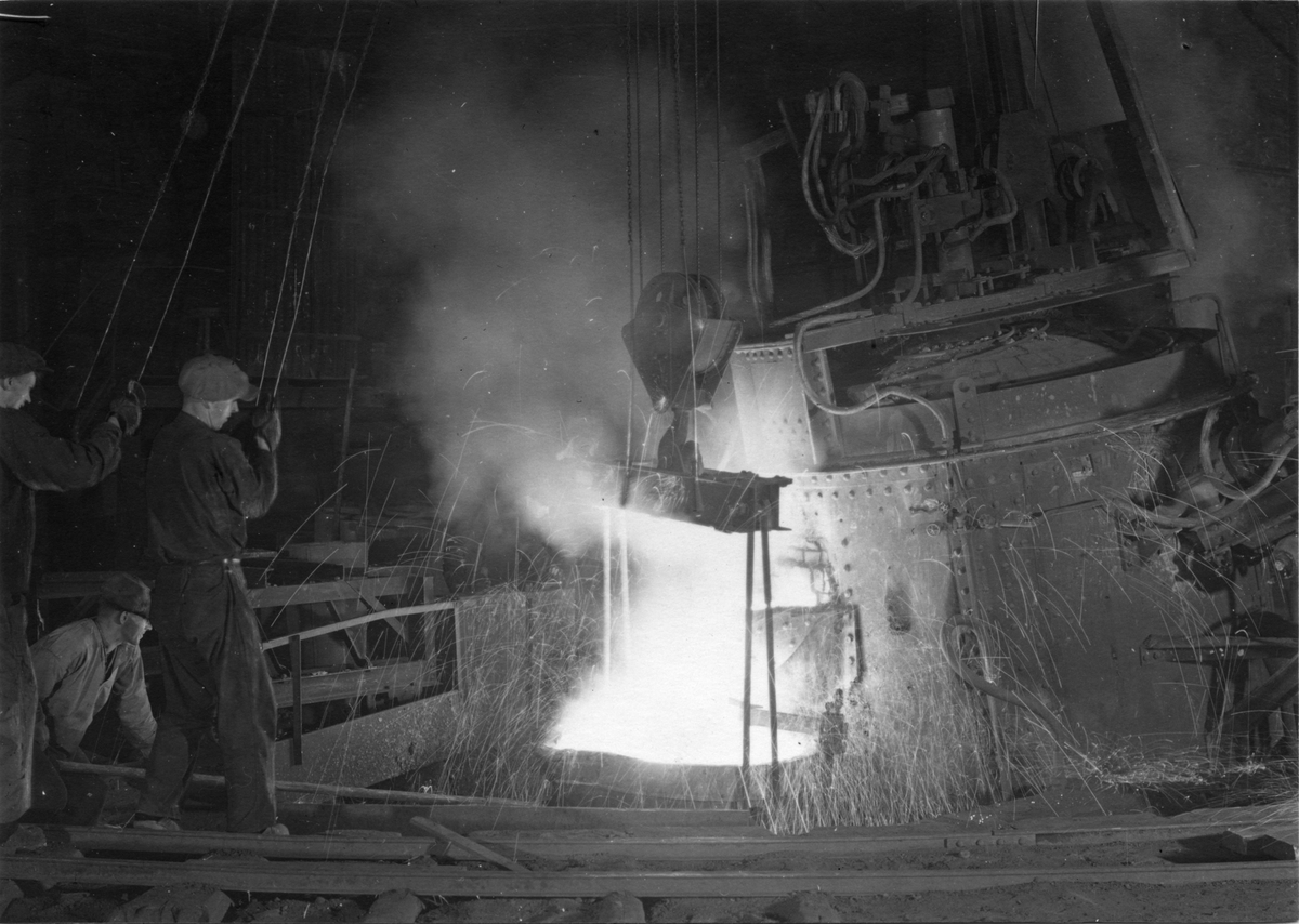 Hagfors bruk. Ståltappning vid en fyra tons elektrostålugn av Rennerfeldttyp.