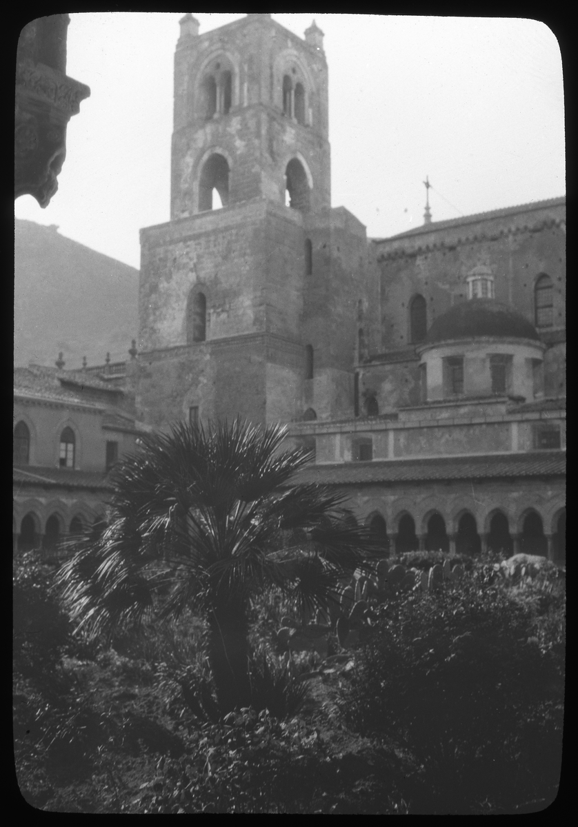 Skioptikonbild från institutionen för fotografi vid Kungliga Tekniska Högskolan. Bilden är troligen tagen av John Hertzberg under en resa i Europa. Hertzberg blev docent i fotografi 1921vid Kungliga Tekniska Högskolan i Stockholm. Kyrka (troligen i södra Europa).
