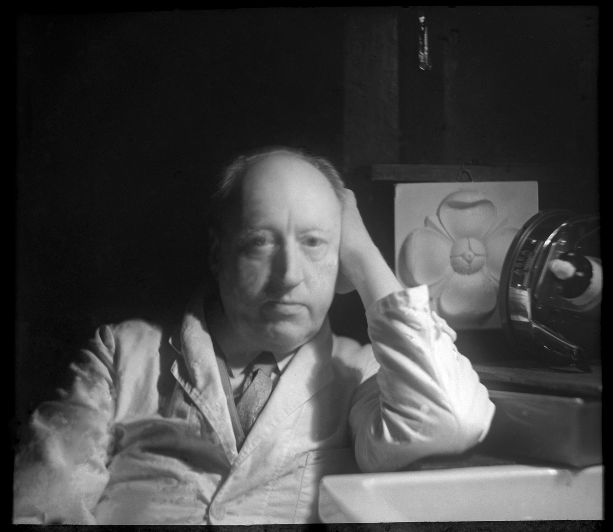 Skioptikonbild från institutionen för fotografi vid Kungliga Tekniska Högskolan. Motiv föreställande självporträtt i "mörkt" rum av John Hertzberg.Belysningen utgjordes av en mörkrumslykta med två glödlampor på resp 40 och 25 watt bakom svartfilter Bl. 1:4,5# exp, -tid 30 sek. Observera det elektriska värmeelementet och gipsfiguren. På bilden står skrivet Infrarödkänslig plåt. Ljushållare 2 st glödlampor (40 och 25 watt) bakom svart filter 1:4,5. (För mer text se bilden) För mer info se: Bäckström, Helmer. Fotografisk Handbok. Andra omarbetade upplagan. Natur och Kultur. Stockholm. 1958-59. Kap. 145. Olika arbetsuppgifter för infrarödfotografin. s.1074.