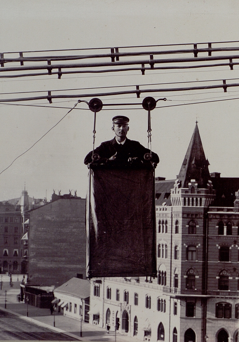 Linbanevagn för luftkablar. I funktion år 1894 hos Stockholm Allmänna Telefonaktiebolag. Konstruktion efter förslag av lf. A.L. Norén. Fotot taget utanför huset Birgerjarlsgatan 7 i Stockholm.