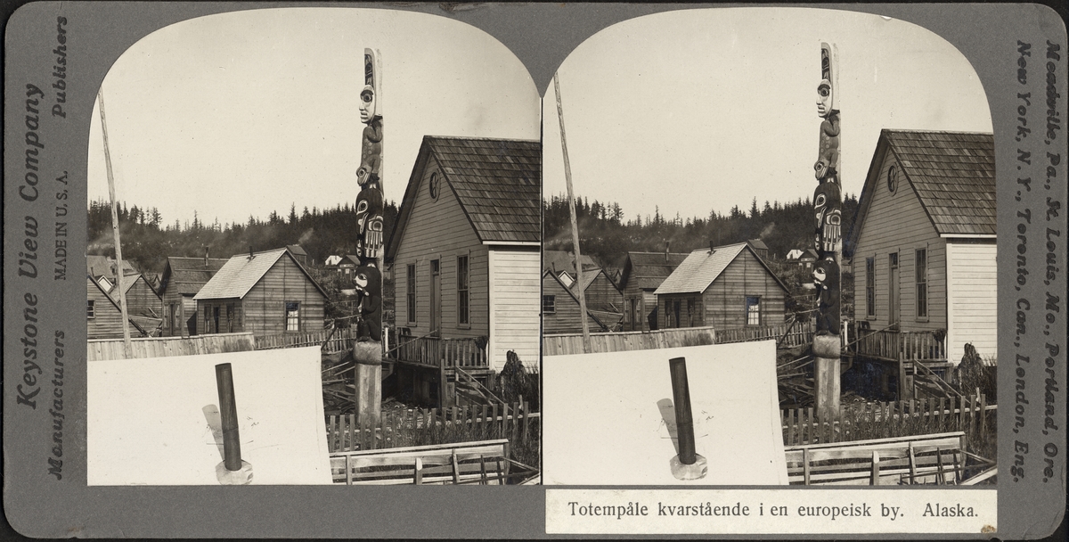 Stereobild av totempåle kvarstående i en europeisk by, Alaska.