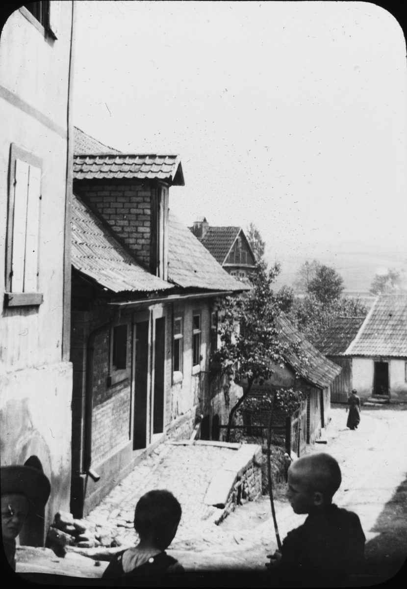 Skioptikonbild med motiv av två små pojkar som blickar ut över okänd stad.