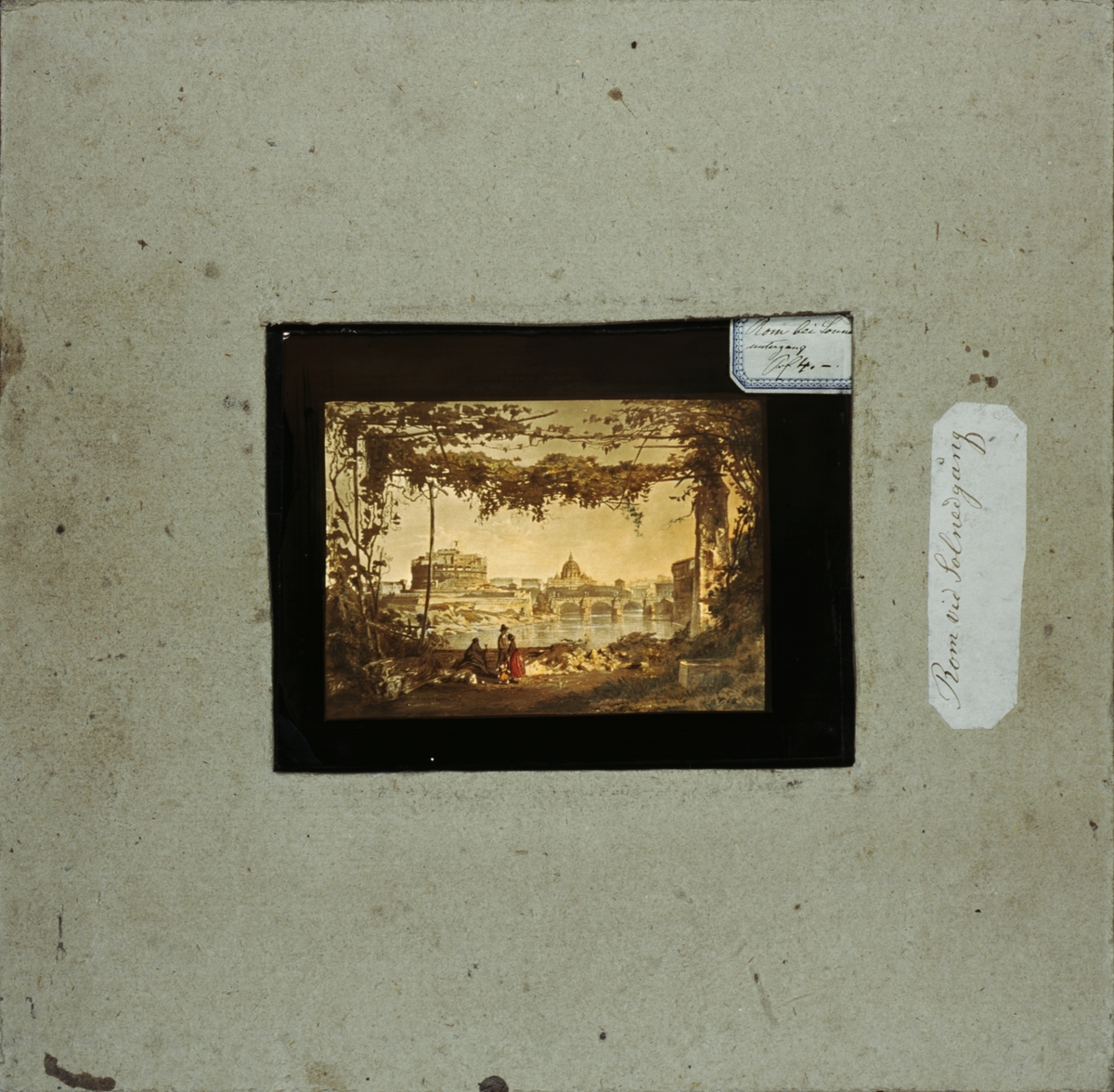 "Rom vid solnedgång". I bildens fond syns några antika byggnader och en bro över Tibern. Några människor är avbildade i bildens förgrund.
