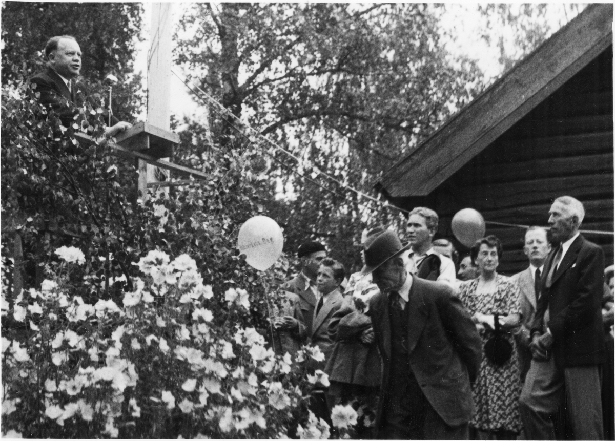 Smedjebackens Valsverks AB. "Valsverkets dag" vid Gladtjärn den 3 aug 1952. Generaldirektör Axel Gjöres håller hälsningsanförandet.