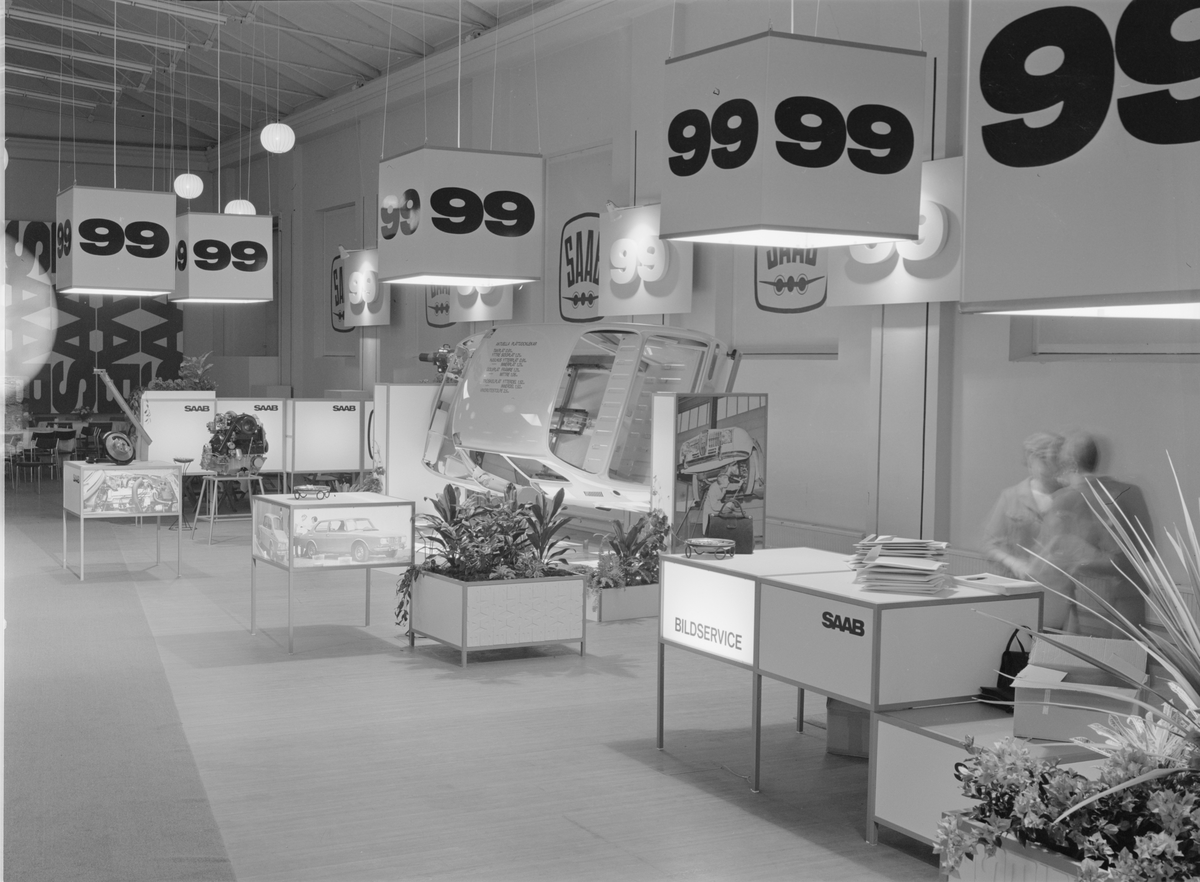 Bild från premiärvisningen av den nya SAAB 99 som ägde rum i Teknoramas hörsal på Tekniska museet den 22 november 1967, kombinerad med en utställning i Wenströmshallen.