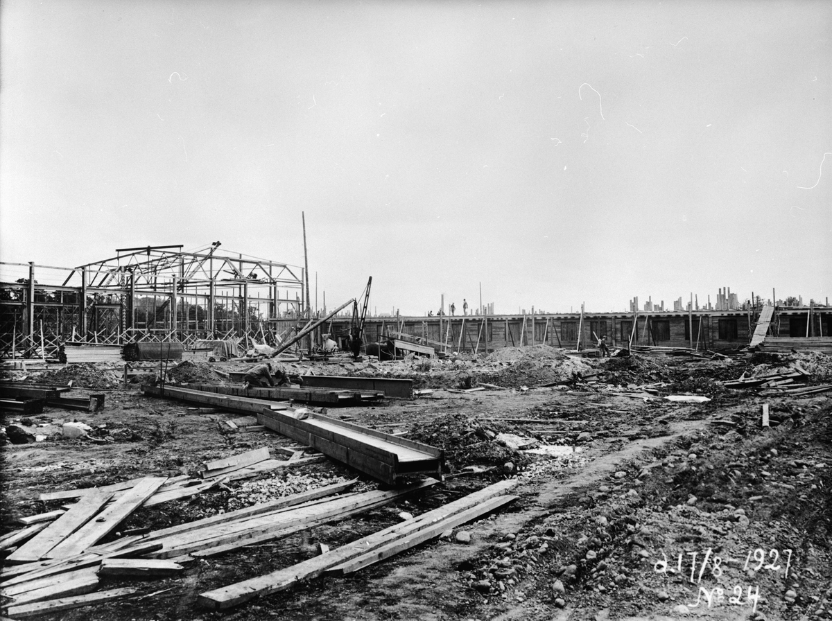 Titel: Byggherre: Bygnadaktiebolaget Contractor, Stockholm. General Motors Nordiska AB:s första fabriksbyggnad i Sverige. Arbetsbild. Hammarbyhamnen 1927.