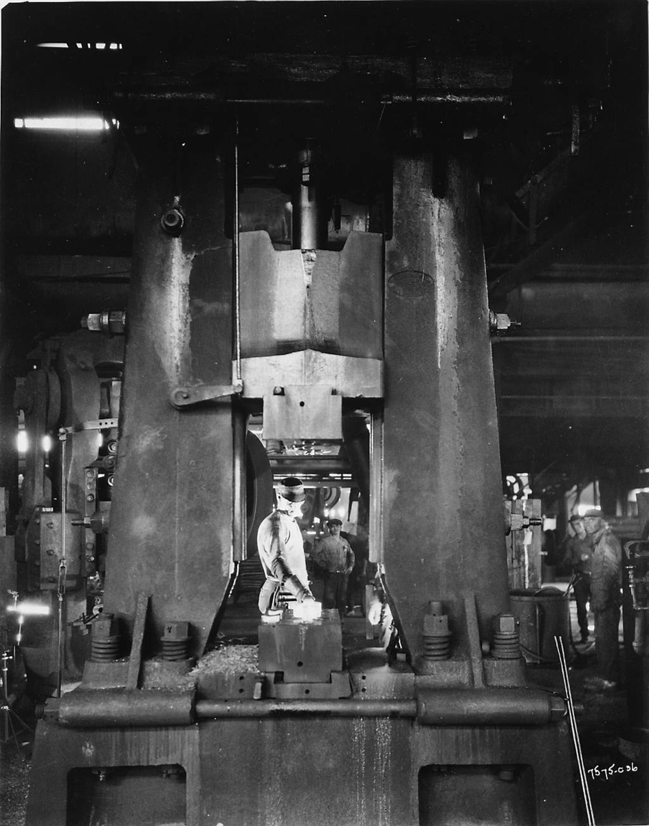 General Motors. Chevroletfabrik. Smide av vevaxel till Chevrolet. Den enorma tre tons hammaren används uteslutande för detta ändamål. Metod ger vevaxlarna en tät och enhetlig struktur.