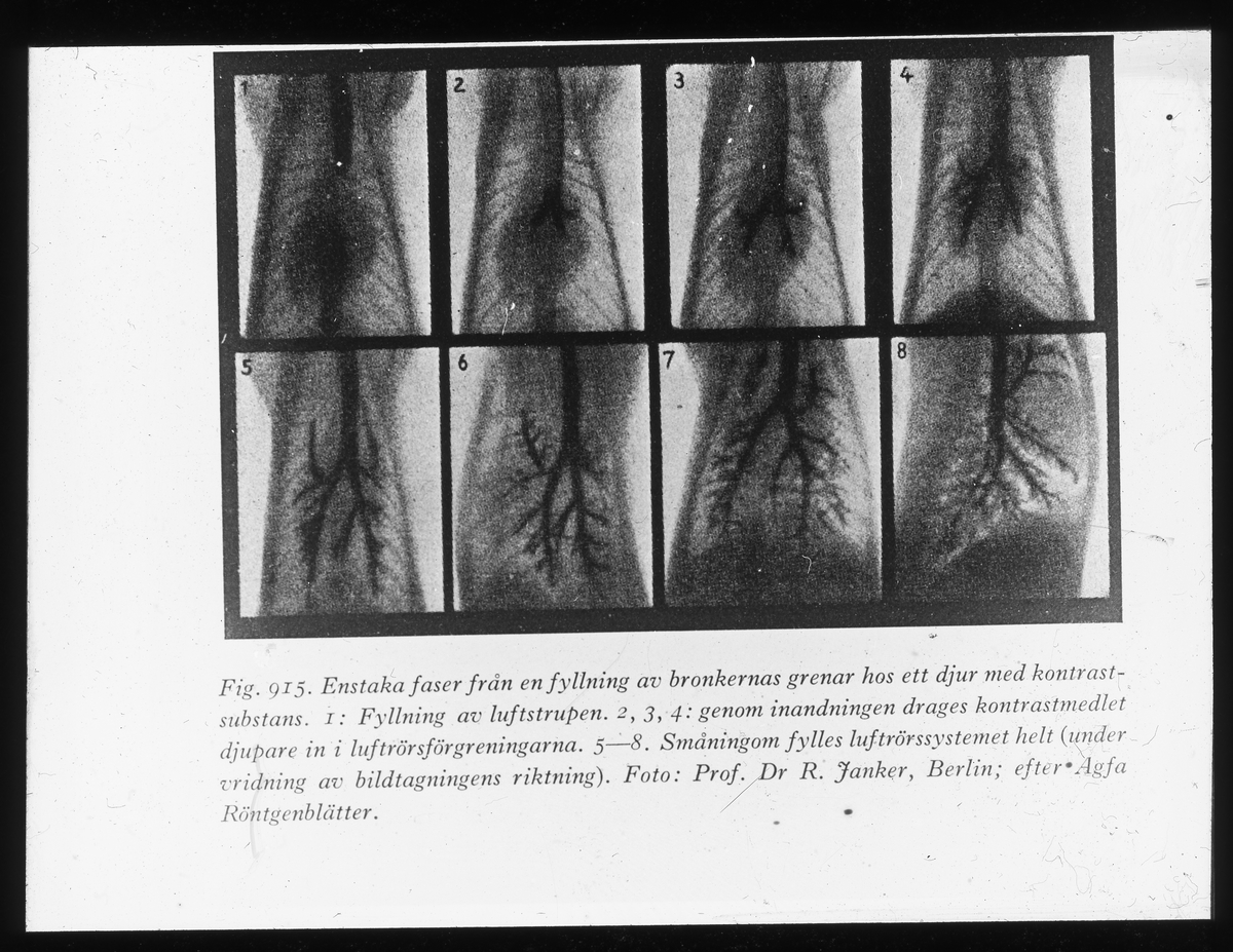 Enstaka faser från en fyllning av bronkernas grenar hos ett djur med kontrastsubstans. 1: Fyllning av luftstrupen. 2, 3, 4: genom inandningen drages kontrastmedlet djupare in i luftrörsförgreningarna. 5-8. Småningom fylles luftrörsystenet helt (under vridning av bildtagningens riktning). Foto: prof. Dr R. Janker, Berlin# efter Agfa Röntgenblätter.