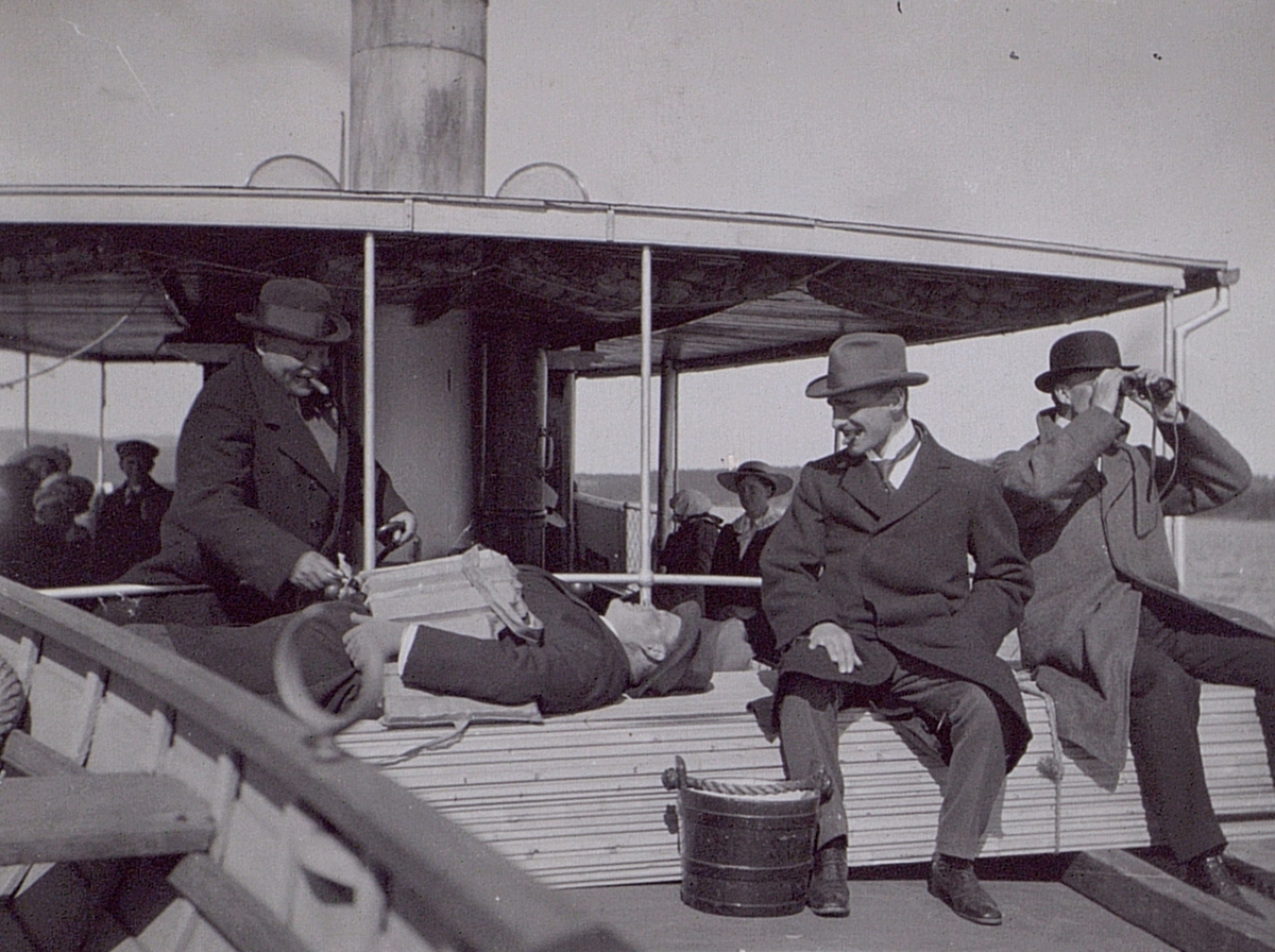 På väg till Hemsön under byggnadstiden 1916. Uddén, Atterberg, Rehndal, Uddenberg.