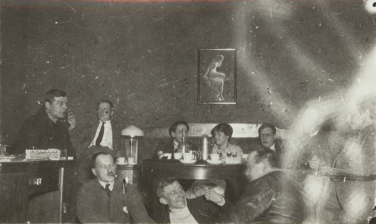 Fotografi från expedition till Spetsbergen. Interiörbild med motiv av en grupp människor som umgås, dricker kaffe och avec.
