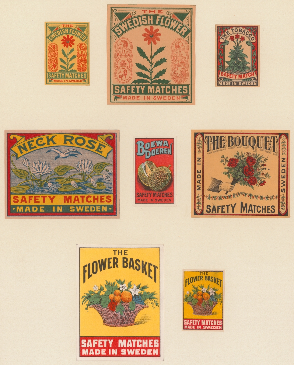 Etiketter för tändsticksaskar, från Svenskt Industri- och Handelsmuseum.