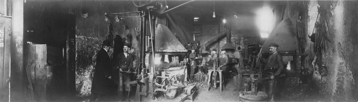 Klensmedja, grovsmide och hejarsmide vid Tönshammars bruk. Till vänster C. J. Bruce. Till höger handsmeden A. Hult.