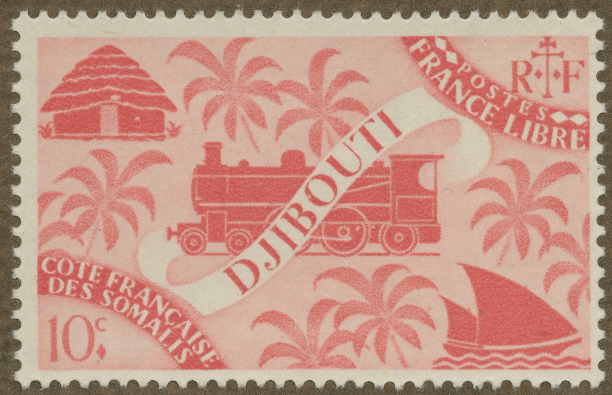 Frimärke från Somaliland, Djibouti, 1943. Motiv av hydda i Djibutij (Djuboiti), Somaliland.