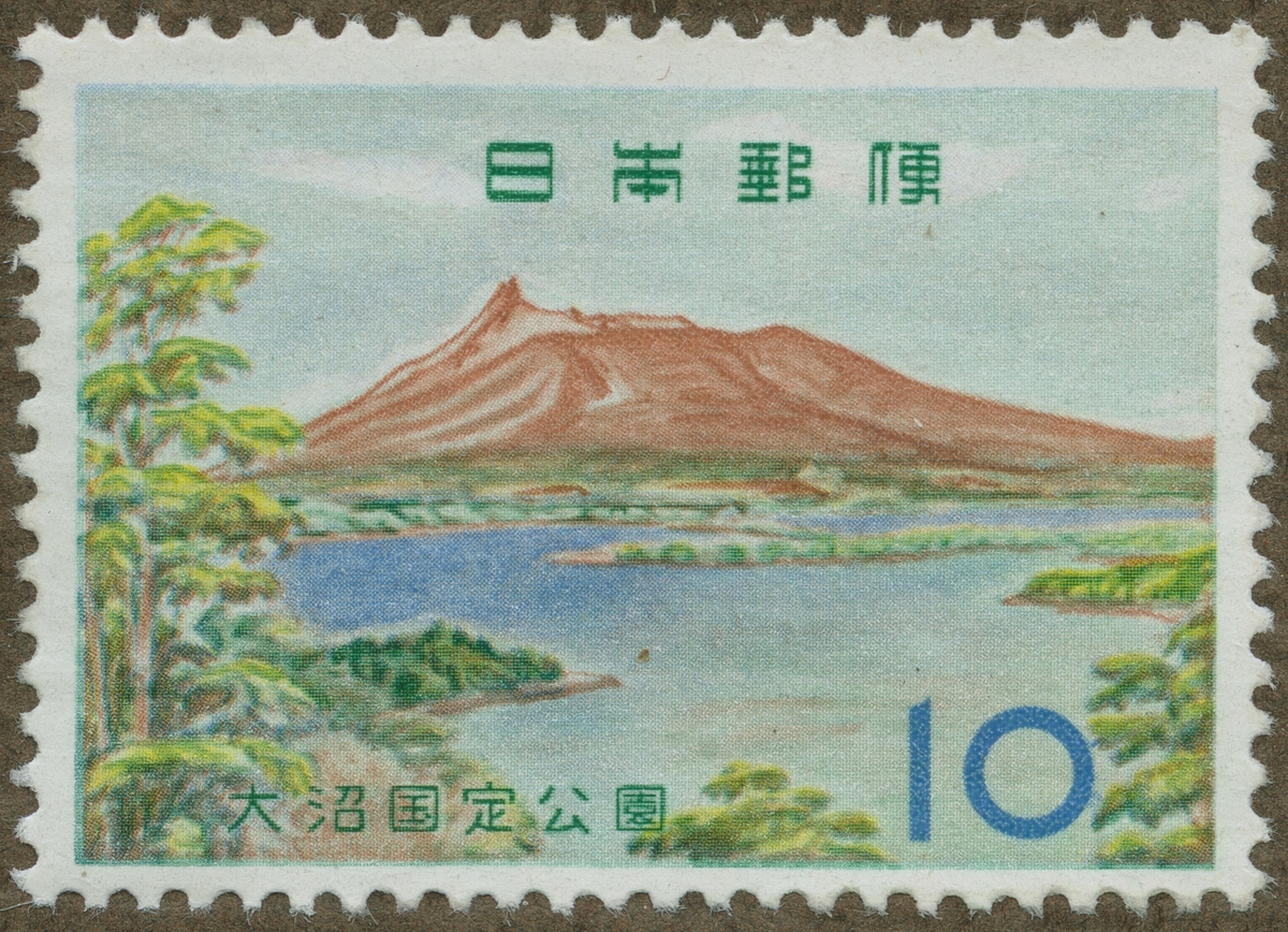Frimärke ur Gösta Bodmans filatelistiska motivsamling, påbörjad 1950. Frimärke från Japan, 1961. Motiv av Nationalparken Onuma med berget Komagatake