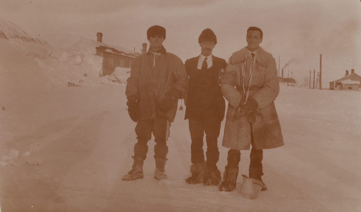 Fotografi från expedition till Spetsbergen. Motiv av tre män som poserar vid Sveagruvan.