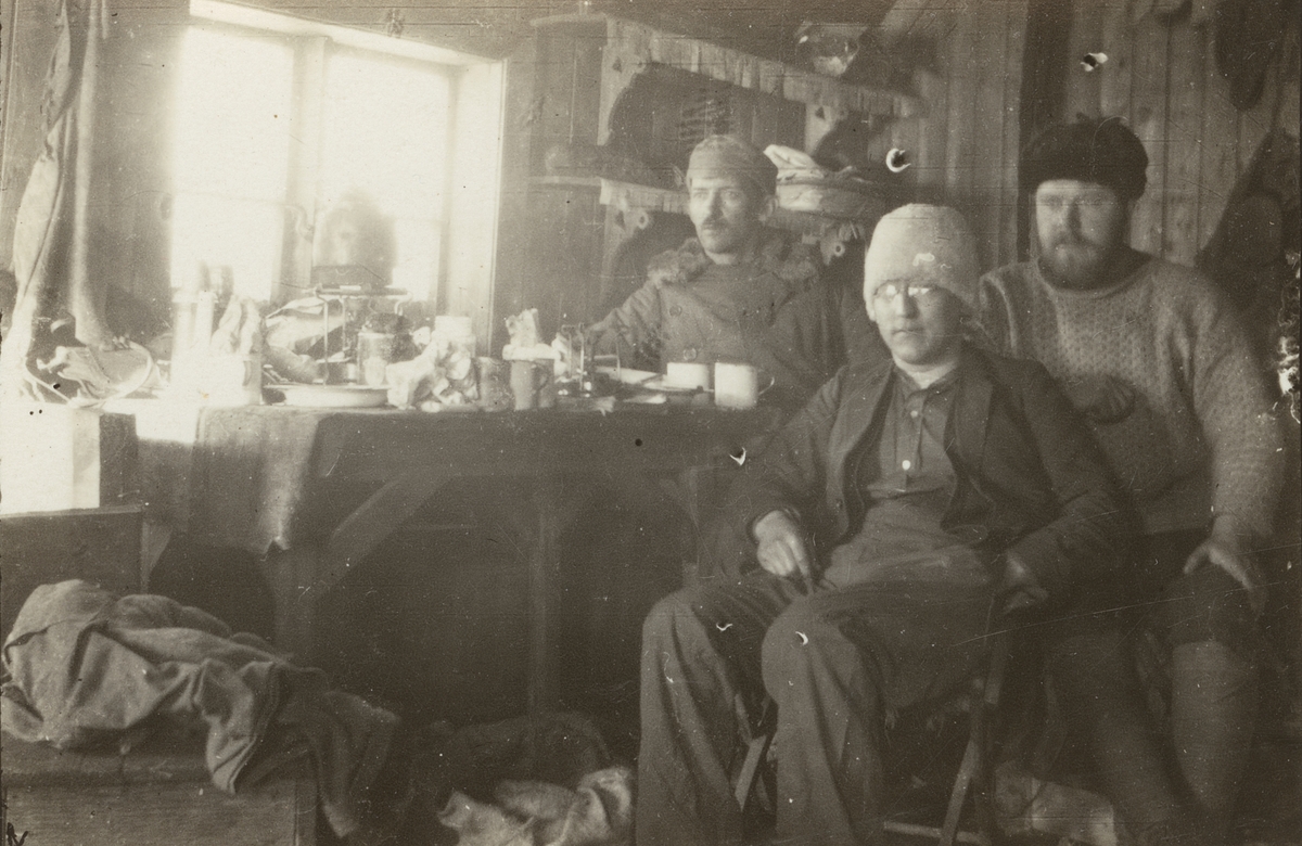 Fotografi från expedition till Spetsbergen. Motiv av tre män som sitter i ett litet trähus.