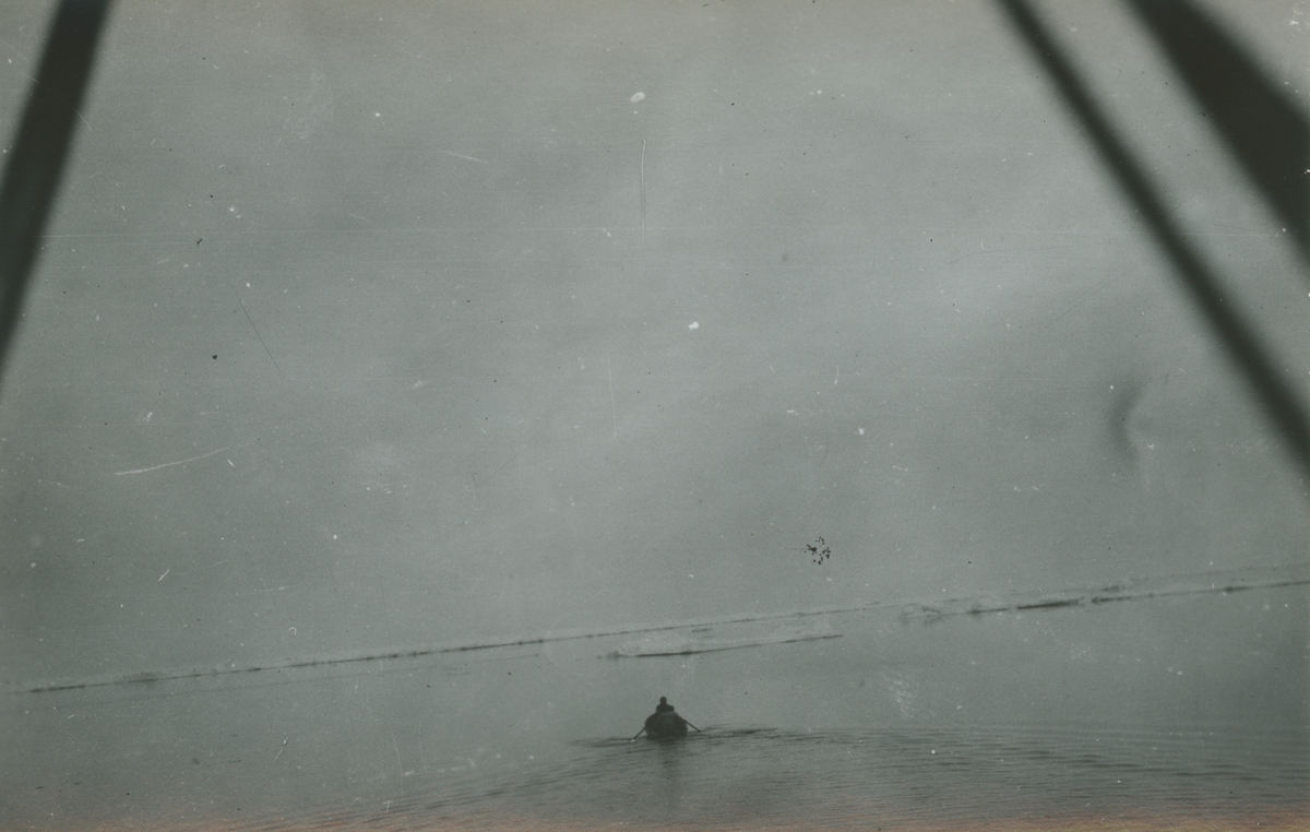 Fotografi från expedition till Östgrönland 1929. Dansk-svensk expedition under ledning av Lauge Koch. Svenska deltagare: Oscar Kulling och Helge Backlund. Vy över hav med isflak och man i liten roddbåt.