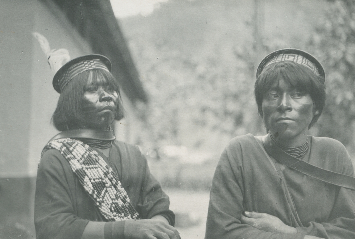 Fotografi från Peruexpedition 1920. Motiv av två män med små hattar på huvudet. En av männen har en fjäder i hatten och ett brett pärlsmycke över bröstet.
