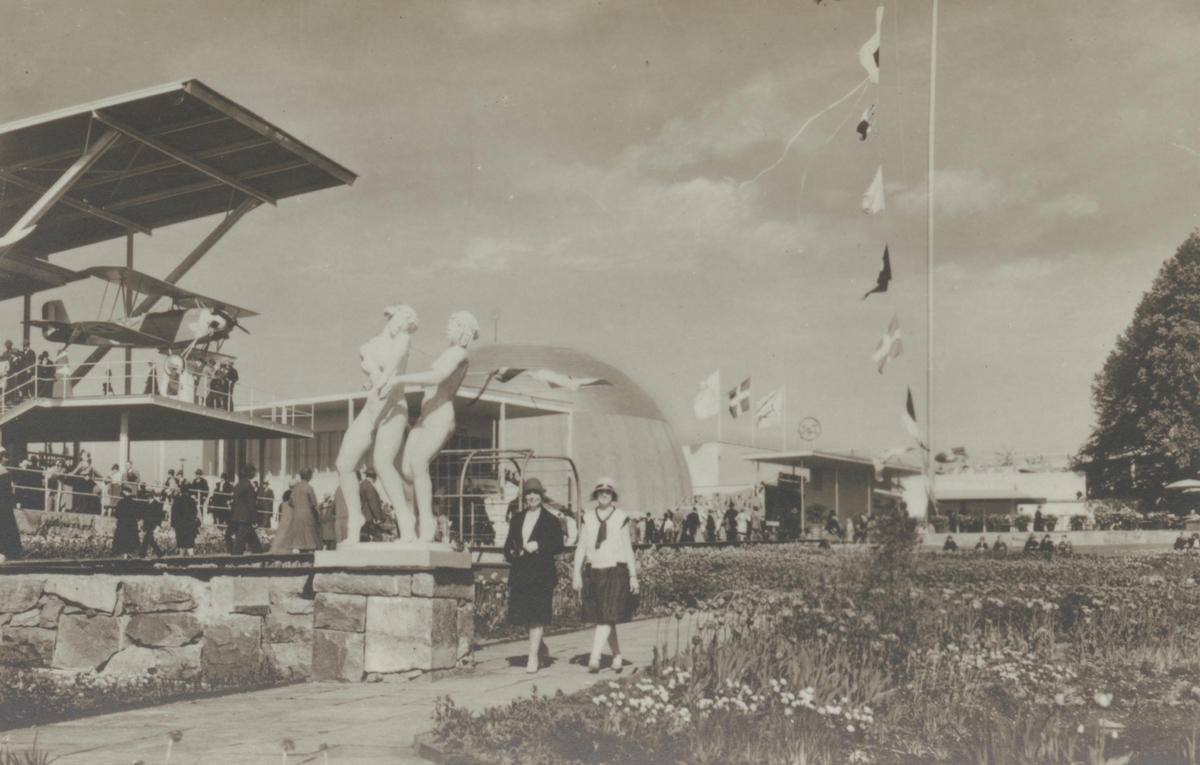 Fotografi från Stockholmsutställningen 1930. Motiv av Alnarpsträdgården, kvinnor och staty.