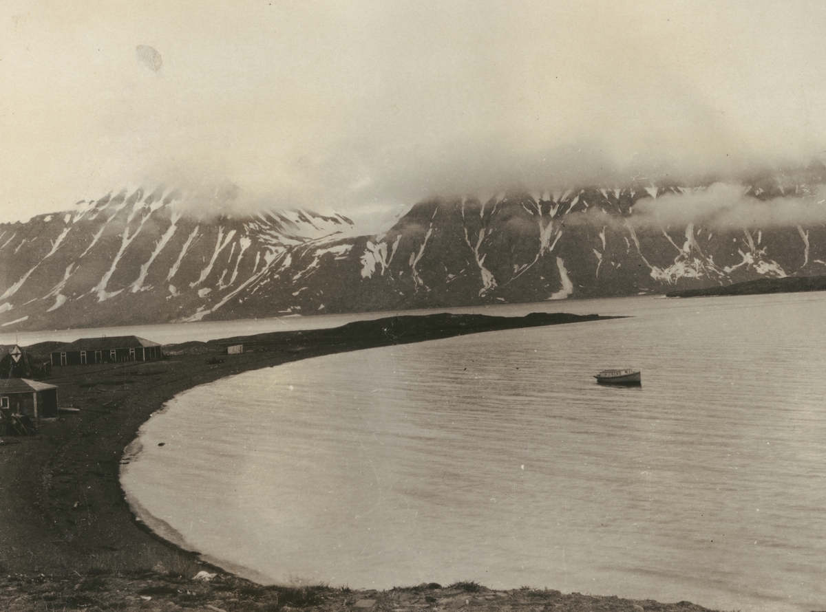 Fotografi från expedition till Sveagruvan. Vy över havsvik med snötäckta berg i bakgrunden. På stranden syns några hus.