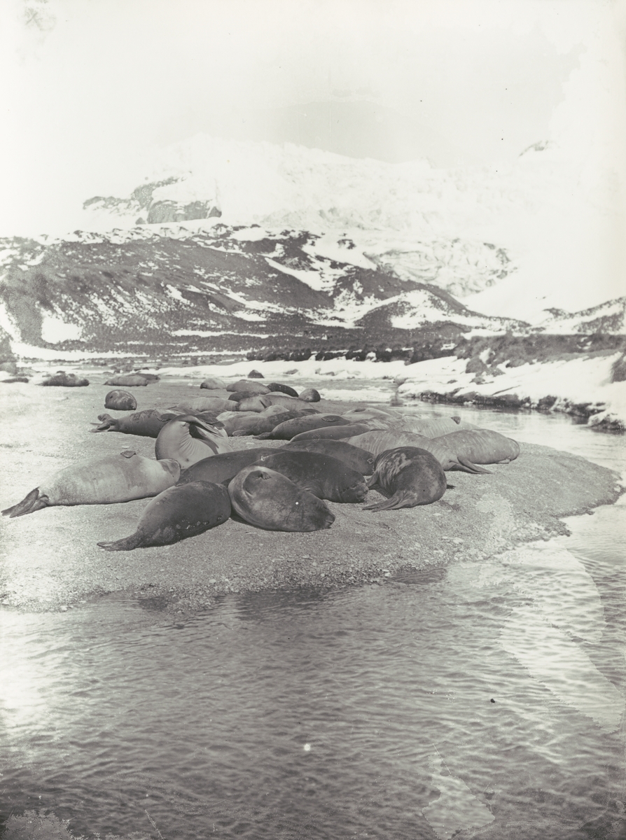 Bild från expedition i Antarktisområdet. Motiv av sjöelefanter och snötäckta berg.