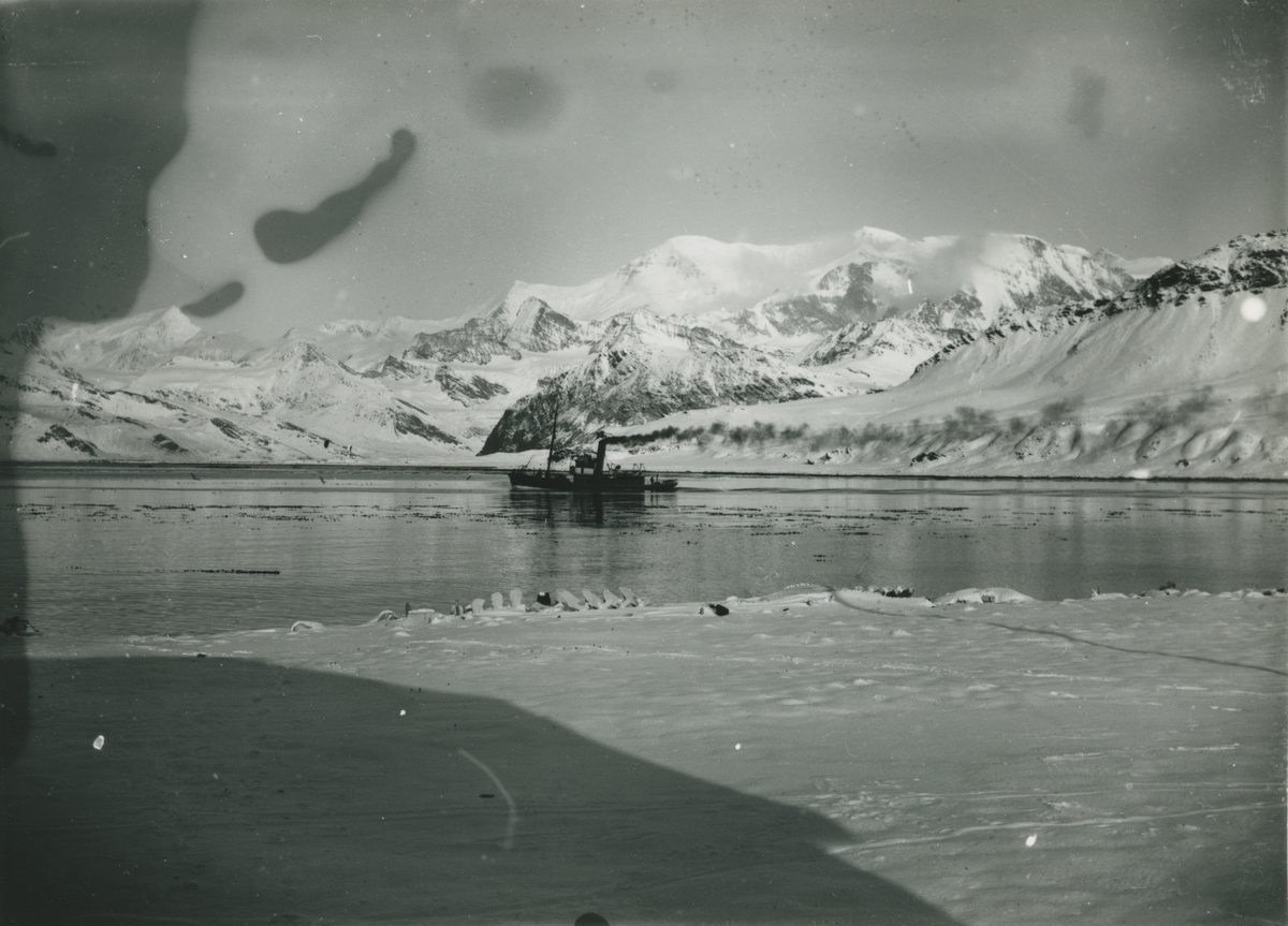 Bild från expedition i Antarktisområdet. Motiv av båt och snötäckta berg.