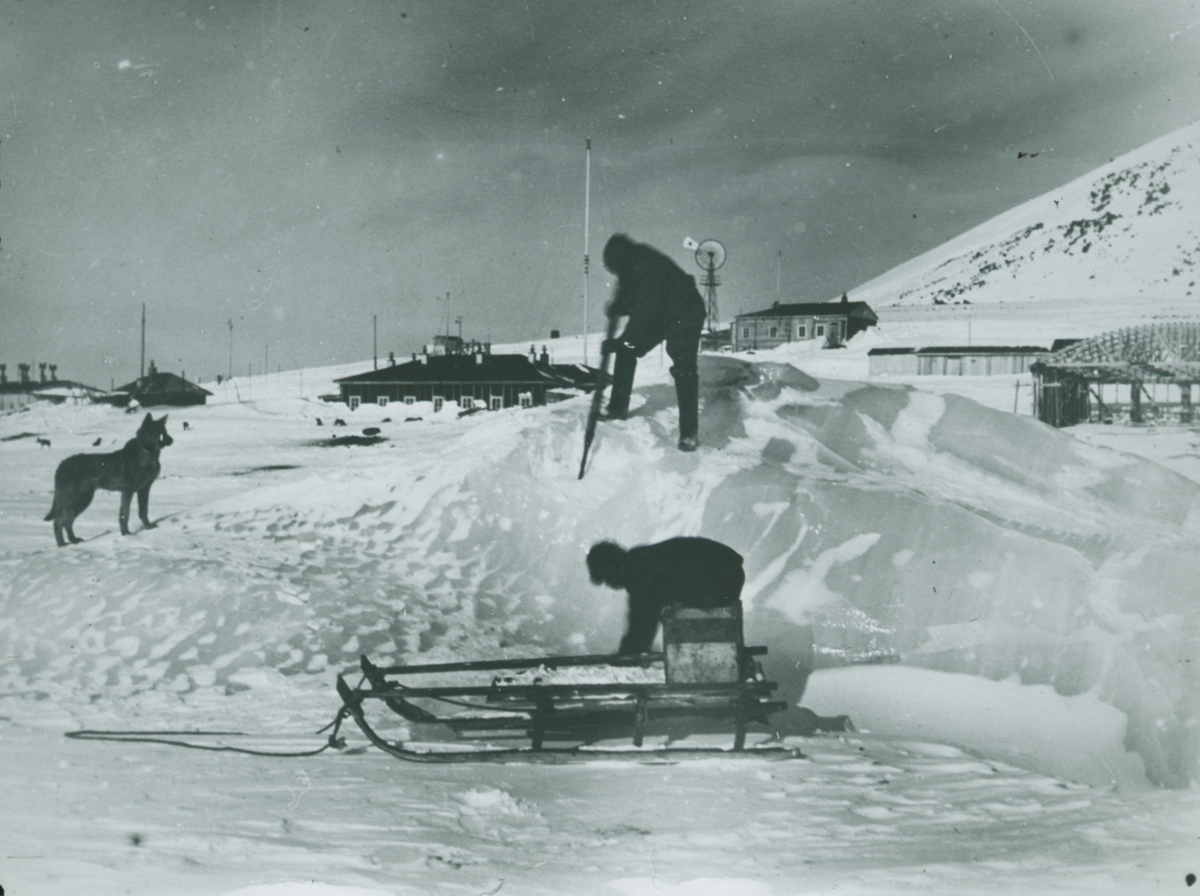Glasnegativ med motiv av barn med släde, man med spett på ishög, hund. I bakgrunden ett antal hus.