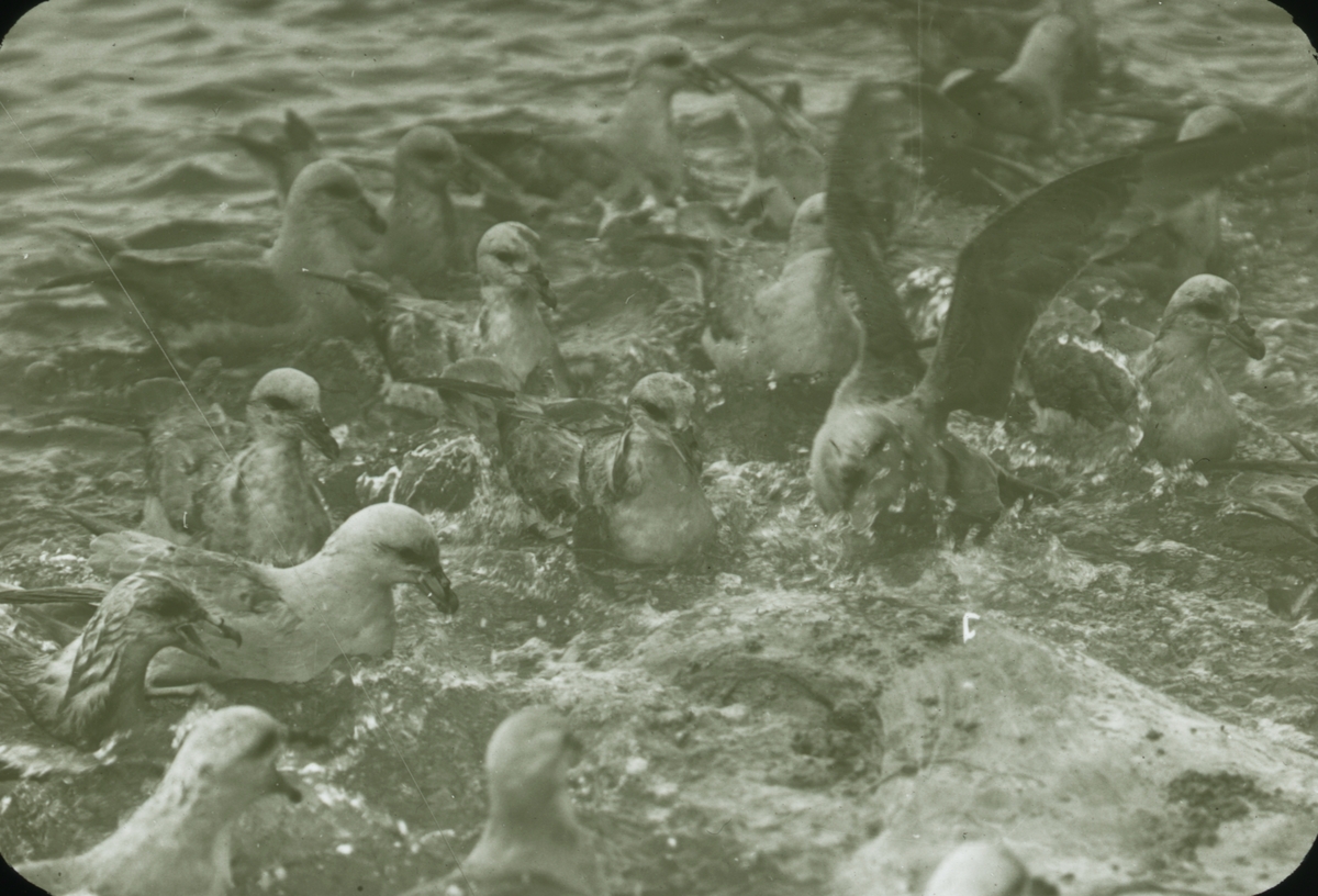 Fotografi från expedition till Spetsbergen. Motiv av fåglar som äter slaktavfall i havet.