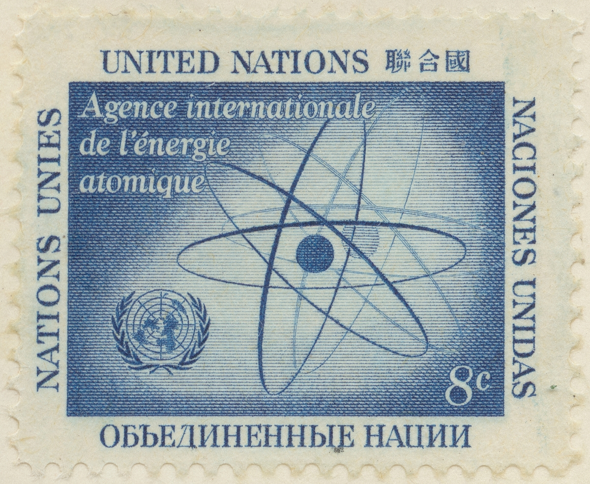 Frimärke ur Gösta Bodmans filatelistiska motivsamling, påbörjad 1950. Frimärke från Förenade Nationer, 1958. Motiv av Atom modell "FN-emblemet som strålkastare på atomen - Minne om "International Atomic Energy Agency""
