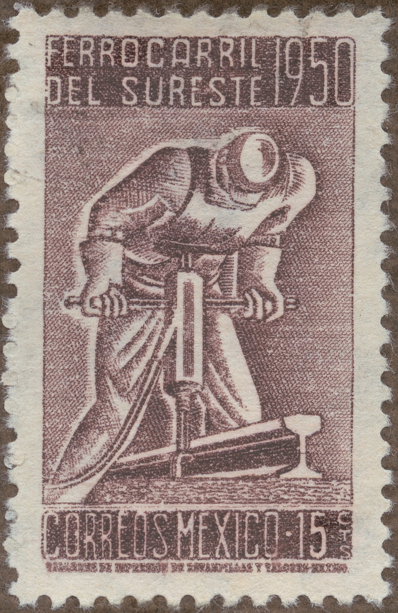 Frimärke ur Gösta Bodmans filatelistiska motivsamling, påbörjad 1950. Frimärke från Mexico, 1950. Motiv av Järnvägsrallare. "Minne om start av järnvägsbygget i Syd-Västra Mexico: 1950"
