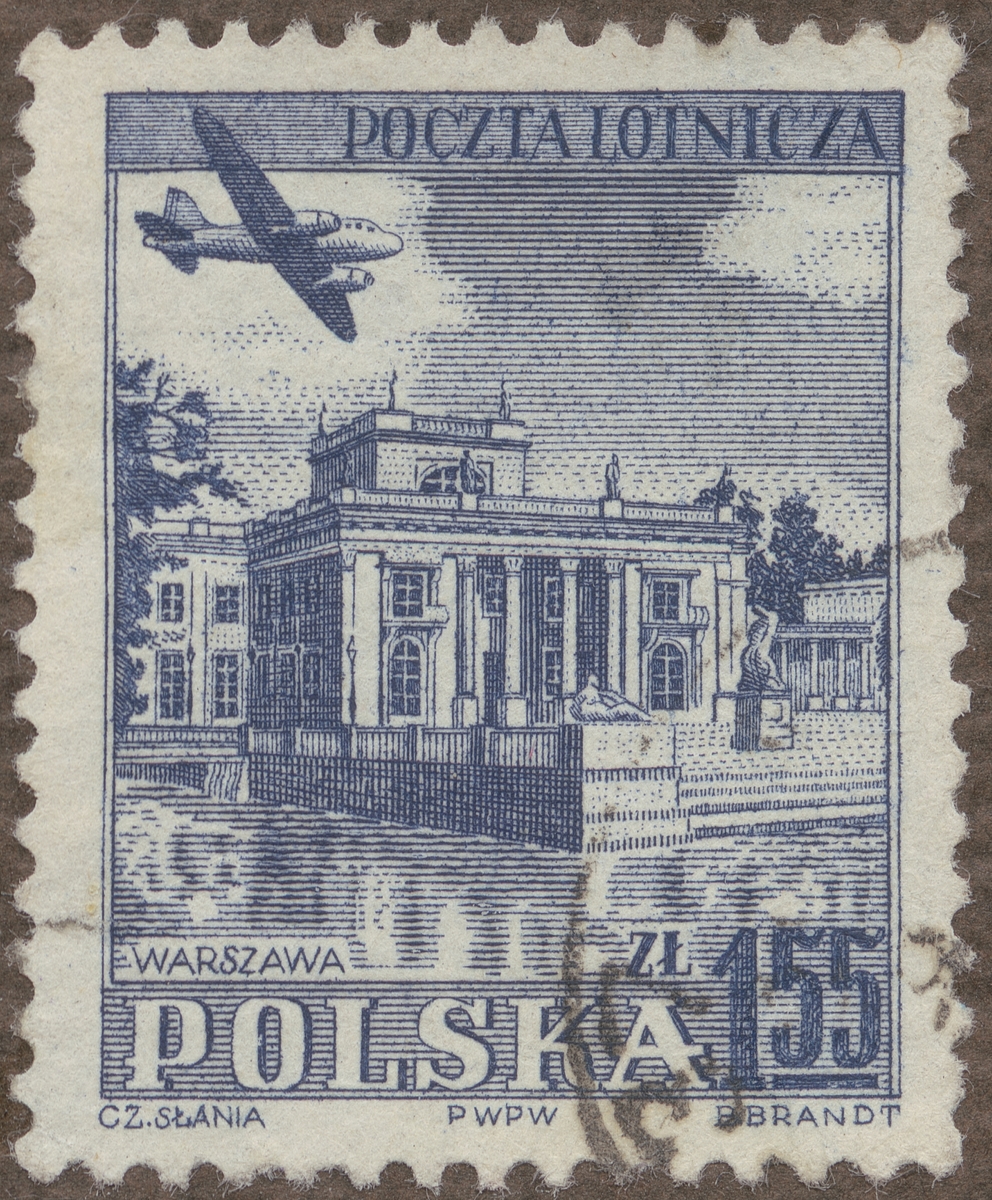 Frimärke från Polen, 1954. Motiv av Tvåmotorigt monoplan över Lazierskyplatsen, Warzawa. "Turistserie med olika städer-"
