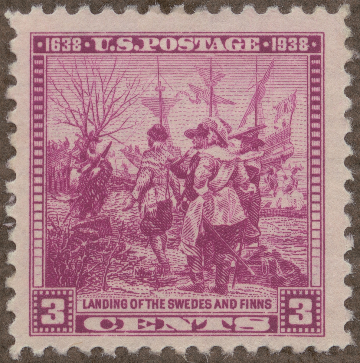 Frimärke från U.S.A., 1938. Motiv av Svenskar och finländare landstiger i Delaware: 1638. - Första svensk-finska koloni i USA. I bakgrunden emigrantskeppet samt urfolksamerikaner. (Efter tavla av Stanley M. Arthur) -300-årsminne av "Nya Sverige" 1638-1938.
