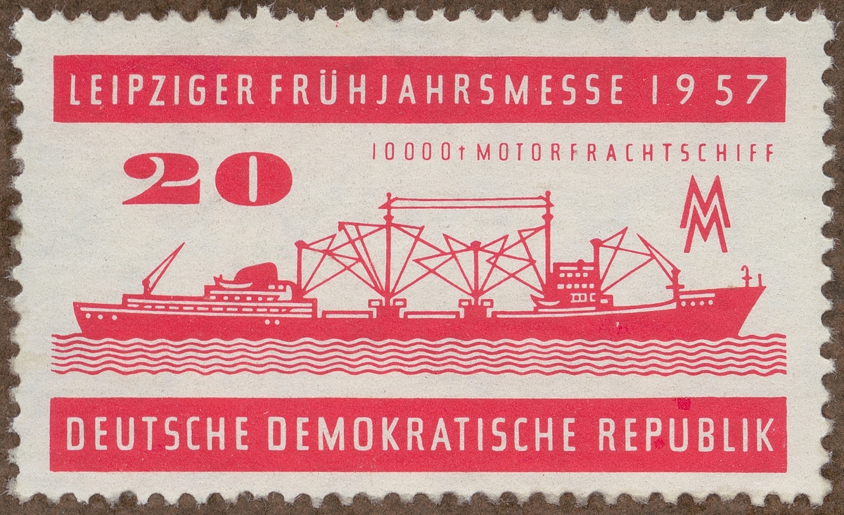 Frimärke från Öst Tyskland, 1957. Motiv av Tyskt frakttfartyg på 10.000 ton, motordrivet Leipziger Vårmässa 1957