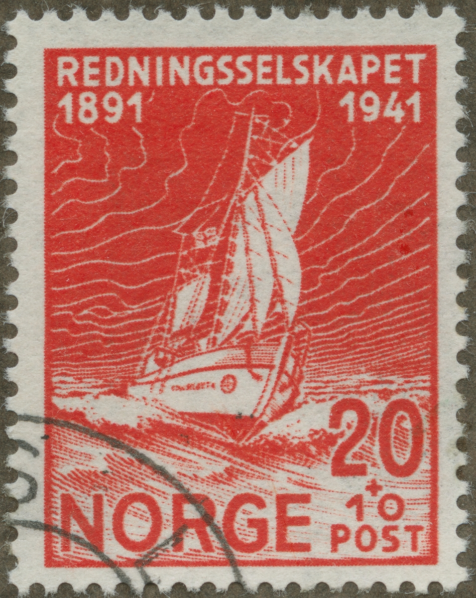 Frimärke från Norge, 1941. Motiv av Norsk livräddningsbåt Livräddningssällskapet 50 år 1891-1941.