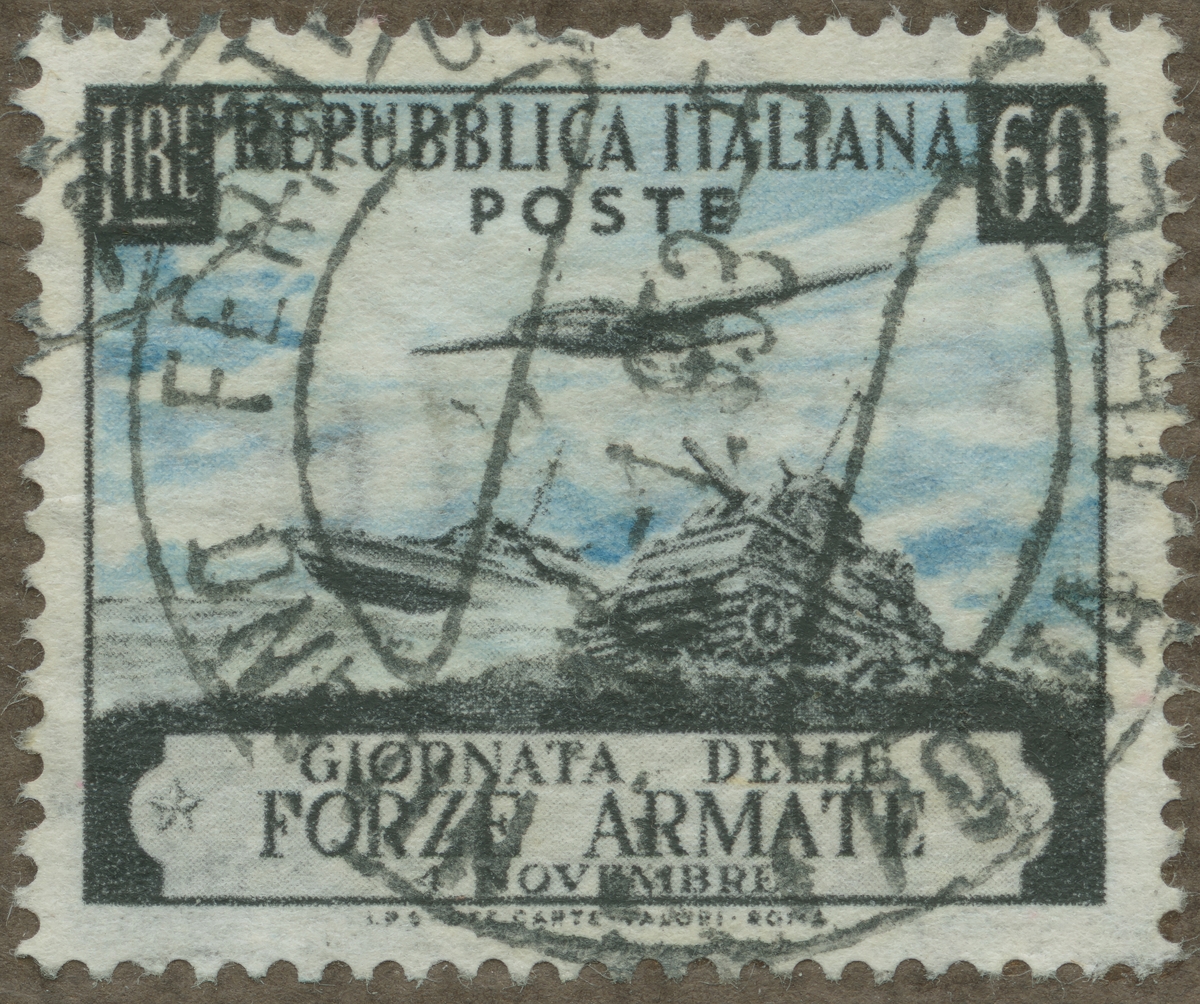 Frimärke från Italien, 1952. Motiv av Torpedjagare Monoplan Pansarvagn Försvarets Dag 4 november 1952