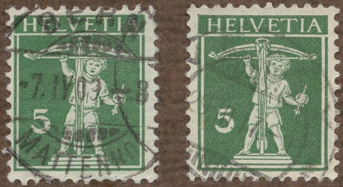 Frimärke från Schweiz, 1909. Motiv av Gosse med pilbåge (Wilhelm Tells son) Det vänstra märket har bågen på fel sida om skaftet