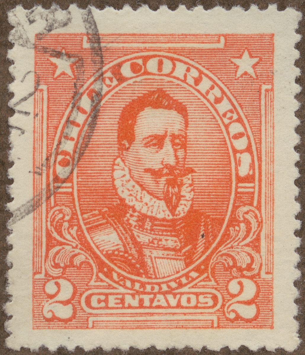 Frimärke från Chile, 1911. Motiv av Pedro de Valdivia Övervann Araukanerna år 1540 Grundade städerna Valdivia och Santiago 1552