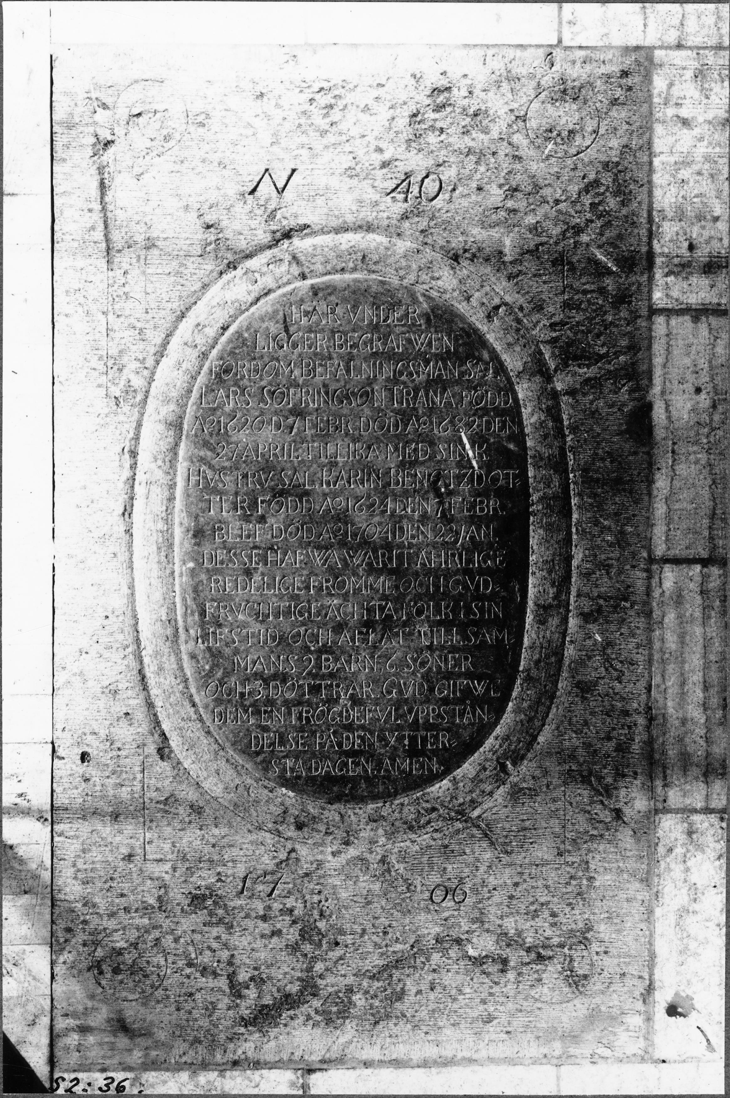 Gravhäll över Lars Trana, avliden 1704, och dennes hustru. Inskriptionen nyhuggen 1949.