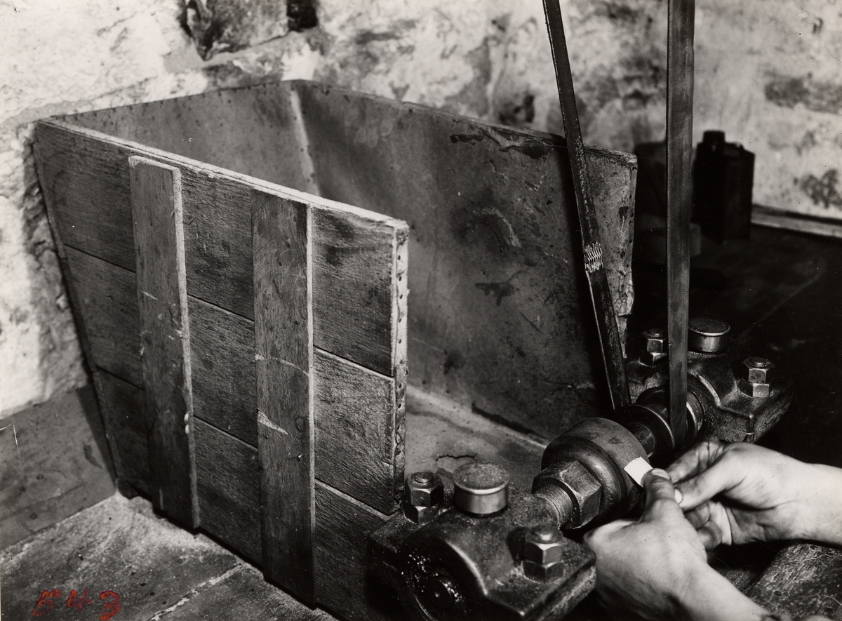 Knappnålstillverkning vid J.H. Tidbeck Metallduksväveri och Metalltrådsvarufabrik. Slipning av knappnålsskaft.