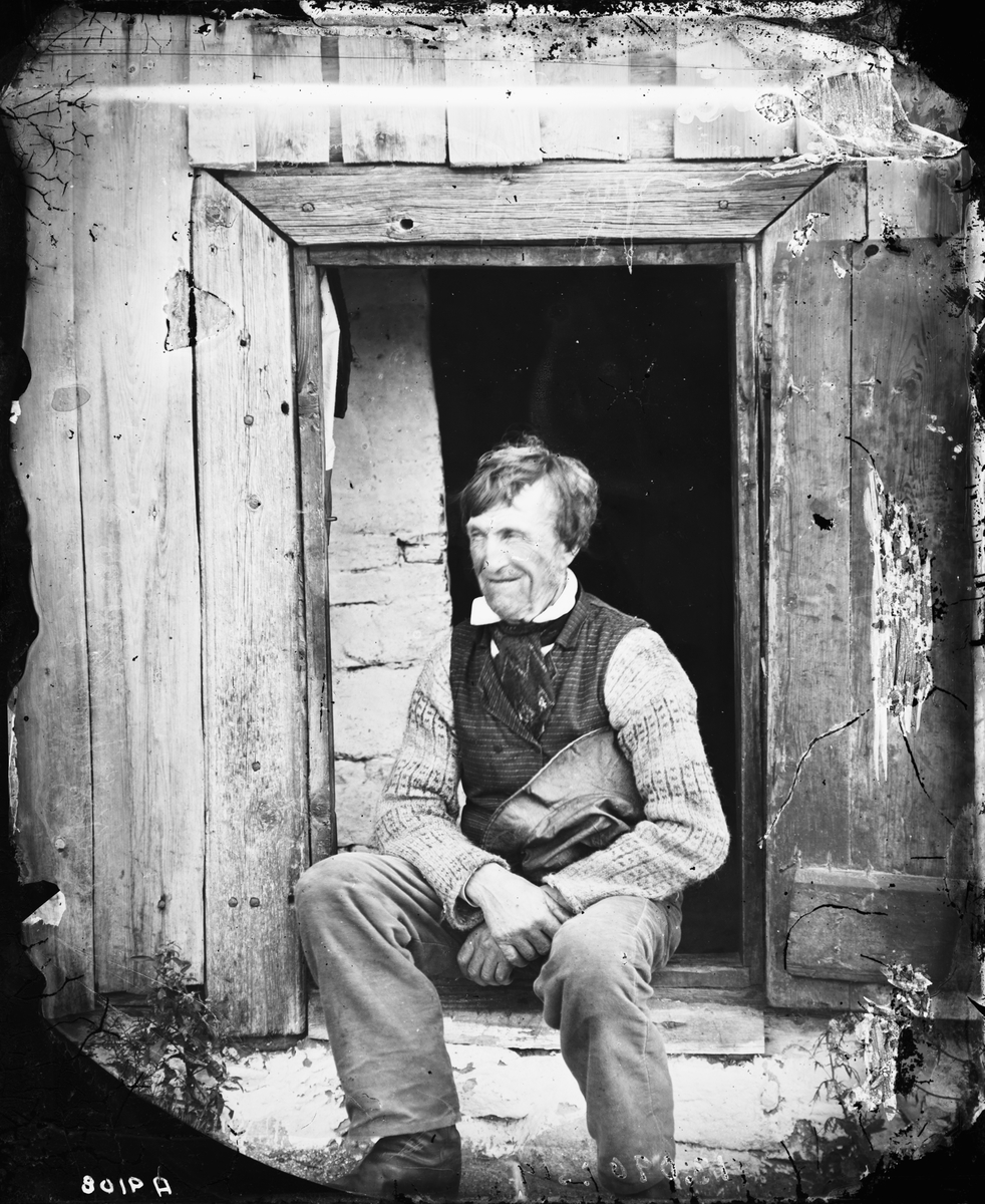 Okänd man sittande i en dörröppning.